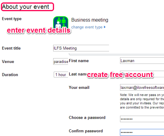 Step 1: On business meeting webpage, you need to fill basic details, such as: event name, venue (meeting place), duration of meeting, time zone, meeting information, reminders (to remind invitees by sending an email before event date), etc. At the bottom part of that webpage, you also have to create a free account. This will help you to store you meeting details as well as help invitees to find out who has sent the invitation.