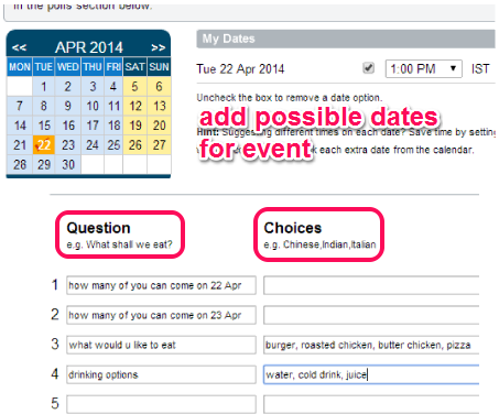 Step 2: It is the simple step in which you have to select possible dates for your event, with the help of a Calender. You can also set polls in this step. Polls would be quite beneficial to ask what people would like to have during meeting hours, items that can be available, as well as option for invitees to select items of their interest. Up to 5 questions can be added to poll and these questions will be visible to invitees in invitation.