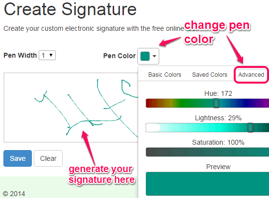 You can create as many signatures as you want with this free online signature maker tool. Apart from just creating the signatures, it lets you select width of pen and color of pen for creating the signatures.