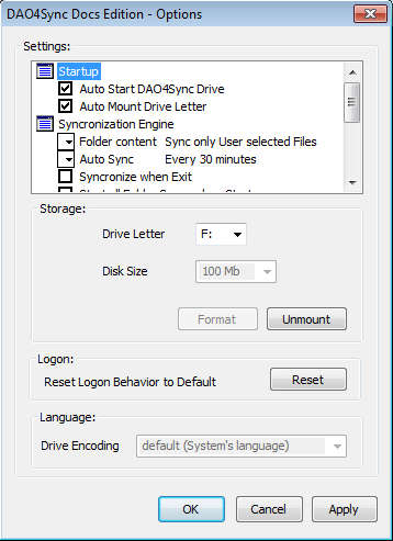 This would be the main configuration window of DAO4Sync, and this is where you’ll be making the majority of changes. Most important thing that you need to do here would be selecting the drive letter if you haven’t when you started DAO4Sync for the first time. After that you’re gonna see an additional partition when you open up My Computer, like you can see on the image above, this means that you can right click on the tray icon again and then on Logon, to enter your Google account login details, so that your files will become visible inside that virtual drive.