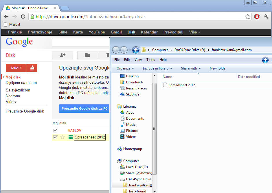 What you see on the image above is Windows Explorer with our Google Docs files opened within it. In the background you can see a Google Docs account and as we are creating documents on our computer, they are also being simultaneously updated and showed on our Google Docs account online. DAO4Sync isn’t very difficult to use, and the application isn’t very large, very small amount of computer resources is necessary for it to work.