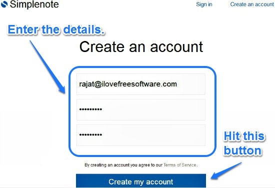 You can create a Simplenote account from either the web interface, or via the smartphone app. Signing up is ultra simplistic and all you need to provide is an email address and password, and hit “Create My Account”. Check out the screenshot below: