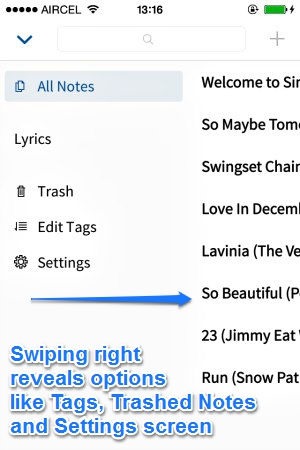 Swiping the main screen to the right reveals shortcuts to essential options like Search, Tags, Trash and of course, the Settings menu. Check out the screenshot below: