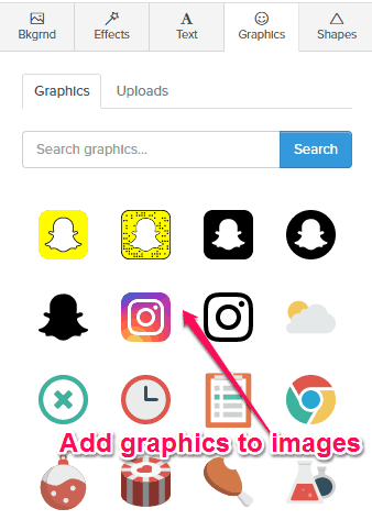 As Canva allows you to add various graphics like icons, illustrations, etc. to the images, Snappa also lets you do the same. It offers tons of predefined graphics which you can add to your social media images. Not only that, it even allows you to upload and use your own graphics from your PC.