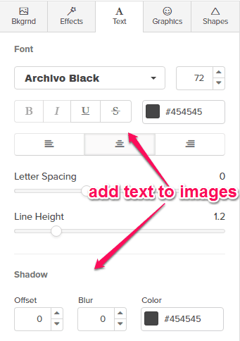 Similar to Canva, this online application also allows you to add stylish typography to your images. You can add a heading text, subheading text, and body text to the images and then customize it. It lets you change the text font, font size, text formatting, color, alignment, letter spacing, line height, shadow, and more to add a beautiful typography.