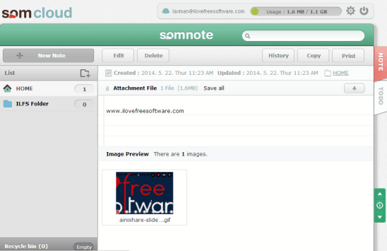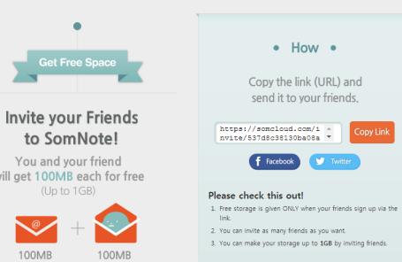 Screenshot above shows my SomNote notes section. You can also create your free account with this tool to claim 1 GB space for storing notes. This 1 GB space could be extended upto 2 GB by inviting friends to join SomCloud. You need to send a URL to your friends. When they will create account using that link, you will receive 100 MB storage space (till 1 GB) for each single account.