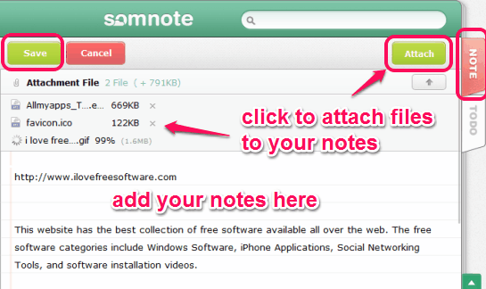 On your SomNote section, click on New Note button, and add your notes. While adding notes, you can even attach a file (less than 100 MB limit for a single file) with that note. Almost any kind of file type can be attached with your notes. Moreover, you can attach multiple files with a single note. Attached file(s) can be downloaded back to PC as well. Hence, it is quite useful when you are accessing your notes on some other device and place. Once your note is prepared, you can tap on Save button.