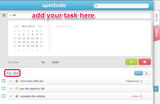 Apart from notes section, you will also find SomTodo section. This section is very simple to use and is used to create to-do lists (tasks that you need to finish). When you are in Todo section, you can use text box to add a task for your to-do list. A memo for a task can also be added using drop down icon. Apart from this, you can even mark a task important, and can set date to finish that task.