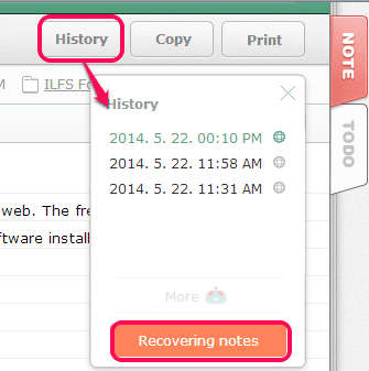 • It provides unlimited time machine feature. This feature is used to go back in history to find the changes in a particular note. Using history, you will be able to restore any version of any note. But this feature is available only with web version (this version) of SomCloud.