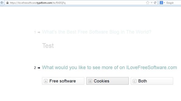 Typeform is a free online form creator where you can create and host feature rich forms that have multiple choice type of questions, picture choice selection, drop down answers, yes/no questions, short/long text answers and so on. Account needs to be registered in order to use Typeform, which also creates a sub-domain to where you can direct users to see your form.