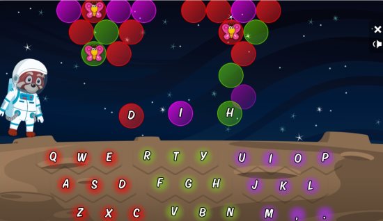 Astro Bubbles is a bubble shooter game. You have to put same colored bubbles together to make them disappear. There is a keyboard given at the bottom and the keyboard in divided into 3 parts left, right, and center. The left side keys are red in color, the right side keys are purple in color, and the center keys are green in color. The top of the screen has different colored bubbles on it. Now you will have 3 different colored bubbles appear from the bottom of the screen with letters written on them. Select any color letter by pressing that letter on your keyboard. Once pressed now you can aim that letter at the bubbles on top of the screen. Match the same colored bubbles and make them disappear off the board. The game has 20 levels to be played in it.