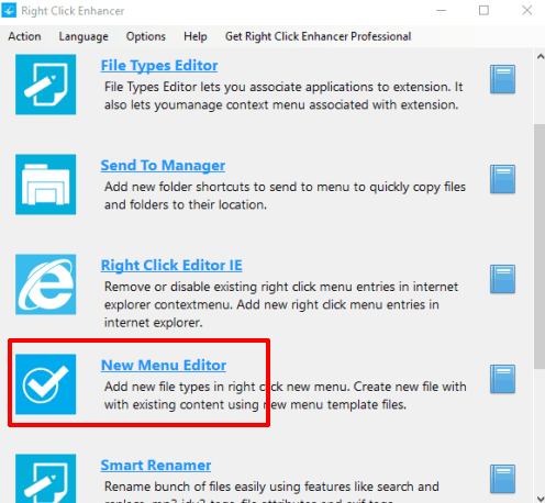 Right Click Enhancer software (available with free and pro versions) comes with different menus to customize the right-click context menu. Its full review can be found here. Among these menus, it has a “New Menu Editor”. You need to use that menu to add new file types in Windows 10 New menu.