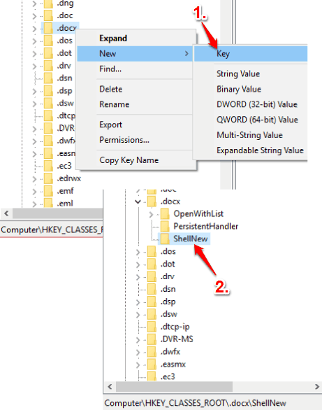 Step 2: To add a particular file type to ‘New’ context menu in Windows 10, you need to create a sub-key under that file type key. And rename it as “ShellNew” key.