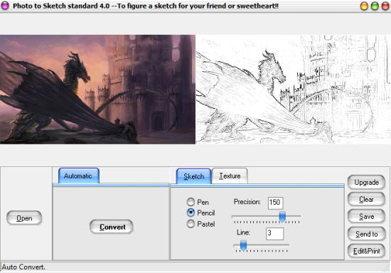 Photo To Sketch (standard version) is also a very good software to turn any JPG or BMP image to a beautiful sketch. The output can be saved as BMP, WMF, or JPG file.