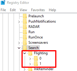 Step 3: Under Search key, there is Flighting key, which further contains two sub-keys: 0 and 1.