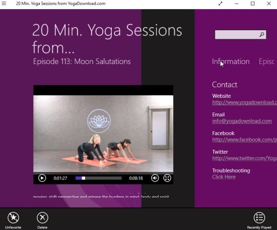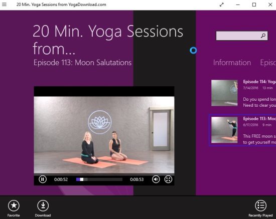 20 Minutes Yoga Sessions from YogaDownload is a free Windows 10 yoga app to get online yoga sessions which can help relax your mind and body. The app offers small videos, which demonstrate yoga poses for you to follow along. You can browse and choose which video you want to follow. There are lots of yoga videos on the app targeting different parts of the body. The best thing is that you can do this yoga session at your own convenience from the comfort of your home.