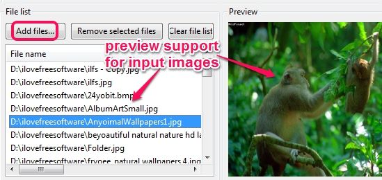 Its interface is not so attractive, but handy enough to perform image conversion process. To convert images, add them from source folder to its interface, either using drag n drop feature or using Add files button. If folder contains other file types (say music files or other documents), then it will automatically sort them, and will add images only. For each added image, preview facility is also available.