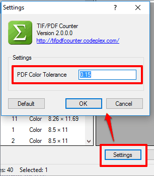 Step 3: This is an optional step. You can click on Settings to set the ‘PDF Color Tolerance‘ for this software. Based on this setting, it checks if a PDF page is colored or BW.