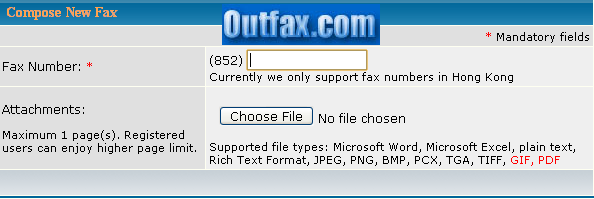 OutFax is a free online fax service to send free fax to Hong Kong fax numbers. OutFax lets you attach Word, Excel, GIF, PDF, JPEG, and TIFF etc files with your faxes.