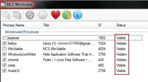 NCS WinVisible is a useful and free software to hide application (that is currently running), all running programs and browsers from taskbar using a simple hotkey. It will stay in your system tray and you can hide all of the running programs or only selected ones. This software has the most unique feature to hide itself as well (even from the system tray) which you won’t find with some similar software. Thus while hiding applications, you can hide its interface too so that no one can open hidden applications by accessing this software (even using its desktop shortcut). Although there’s no password protection available for this software, but it’s ability to hide itself makes it reliable to use. No one can make it and other hidden applications visible unless correct hotkey is hit.