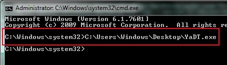 First download YaDT to your PC and then execute its application file from command prompt window. Its download link is present at the end of this article. Open ‘Command Prompt’ window by typing ‘cmd’ in search bar using start button of your PC. After opening it, provide the path of YaDT application file like it is visible in below screenshot: