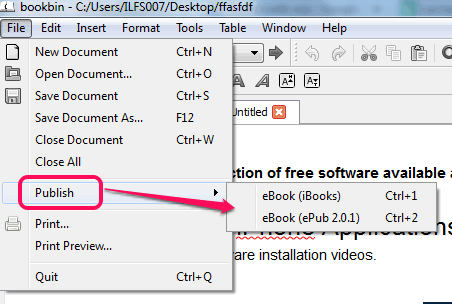 Once you have prepared your document, its time to generate eBook from that document. For this, you can use hotkeys Ctrl+1 (for iBook) or Ctrl+2 (for ePub). Publish option present under File menu can also be used for this. A save as window will open using which you can save the eBook to needed destination location.