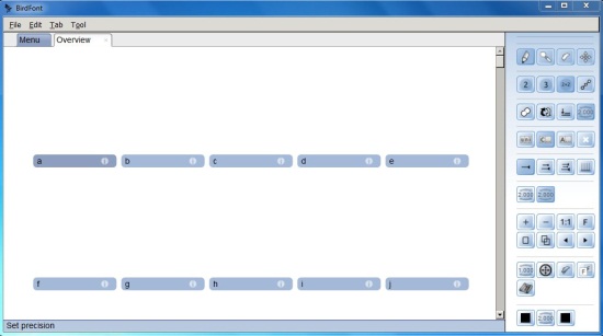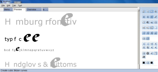 BirdFont allows you to create fonts either from scratch or by using images of fonts you have found somewhere else. The app consists of a tabbed interface with a toolbar placed on the right side. This contains all the necessary tools required to create vector graphics of the font characters. You will be able to view the description of each tool in the status bar on mouse hover.