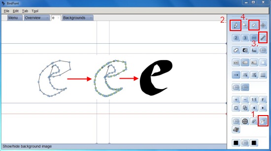 A double click on the desired character will take you to the editor window. Here you can draw vectors for the selected character from scratch, or edit another font’s character using a background image. Let me explain it to you using the background image method.