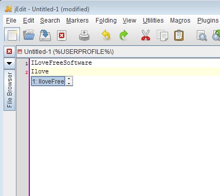 Next time that you type text inside jEdit, words that you’ve added to the database are gonna be suggested to you as you’re typing them inside a document. Now instead of losing time on typing words entirely, you can just select the suggestion and the word is gonna be completed automatically.
