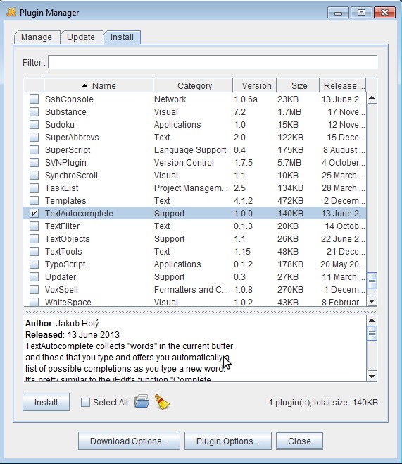 List of words for which you would like to see suggestions is editable. You can add your own words or you can use the auto-detection feature where Text Autocomplete plugin will add words to its database as you’re typing them. jEdit doesn’t come with this free plugin installed, it has to be installed manually by selecting Plugins >> Plugin Manager >> Install. From there you can easily install all the available plugins, not just Text Autocomplete, see image down below.