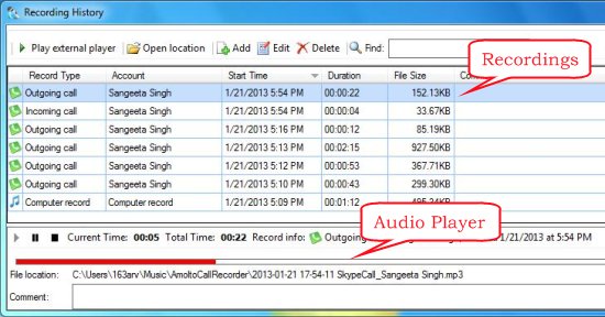 This will open the destination folder where all the Skype recordings are kept. Simply double click on any of the recordings to play it in the integrated audio player. Or, you can open the file location and play the audio files in any of your default media player.