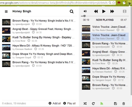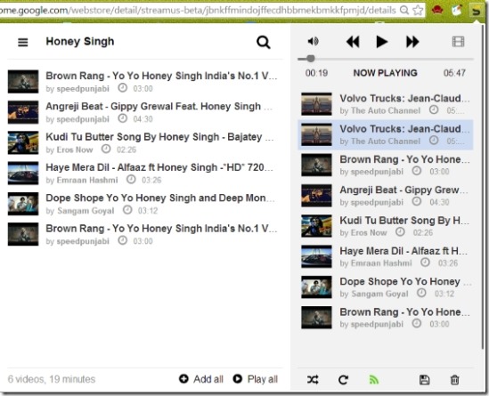 Streamus is a great extension to use. While using Streamus I had no problem in listening to any video at all. Also the user interface is simple to understand. While using Streamus, you can simply add the videos and start listening to them just as your YouTube music player. However the Radio Mode and Share option did not work for me. Still, based on all the nice features and really simple interface I would recommend you to try it out.