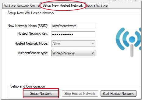 - After this, hit the ‘Setup Hosted Network’ tab and you will be able to setup your new wi-fi hosted network. Just simply choose a desired name for your network and provide your hosted network key at the right field. See the below screenshot. By providing the network name and right password (key), hit the ‘Setup Network’ button. This will create your hosted network and a small window will open up showing you that you have successfully created your wi-fi hosted network.