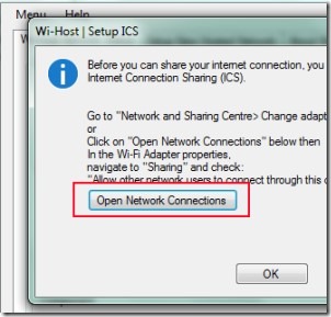 - But the process is not over yet. You can’t share your wi-fi hosted network until you haven’t enabled your Internet Connection Sharing. For enabling those settings, you need to go to Network and Sharing center to change your wi-fi adapter settings. But for your ease, this software automatically provides facility to jump to network settings directly. So when you will click on Yes button to start your new hosted network, a Setup ICS window will come up. Click on ‘Open Network Connections’ in this window and you will move to network connections.