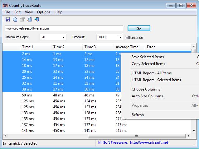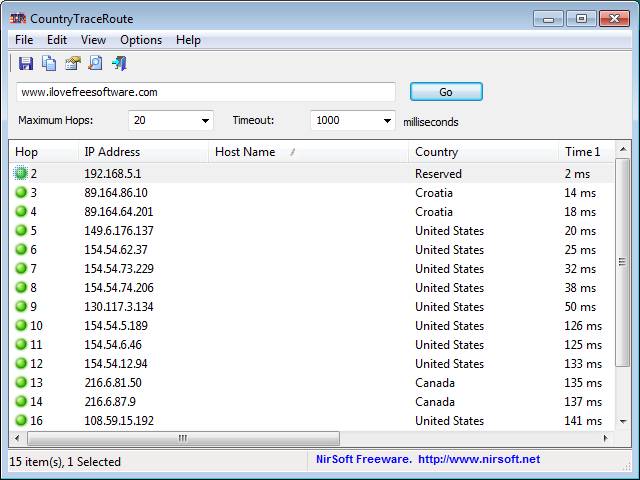 CountryTraceRoute is a free traceroute tool to retrieve information about the number of hops that exist between you and an IP address. It retrieves information like their locations, ping time, and you can also find out the country of origin. This is a great alternative to the Windows tracert CLI application, which offers more features.