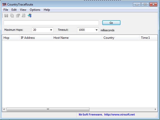 Image above is the default interface of CountryTraceRoute. This free traceroute tool is very simple to use. At the top you have a very simple menu while down below you can see a large empty area where all the hops of the traceroute checks that you perform are gonna be placed. The most important part of the interface would be the input field that you can find in between previously mentioned parts of the software window. This is where either the domain name or an IP address that you are interested in tracing is gonna be entered.