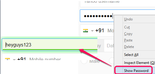 Now whenever you need to view you password hidden behind the asterisks, right-click on that particular field, and click on Show Password option. It will immediately show you the typed password.