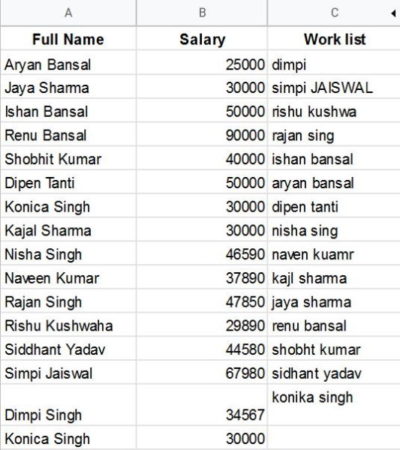 Let’s see how to fuzzy match in Google sheets. For example, you have a sheet with data as shown in the above screenshot. You have name in the first column, salary in the second column, and the third column contains just names.