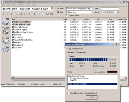 If any read errors occur which can not be fixed, then the software lets you know the exact position where this error occured. Exact Audio Copy uses technologies like AccurateRip and multi-reading with verify to check the audio being grabbed. Therefore, you can be sure of the good audio quality of the grabbed file.