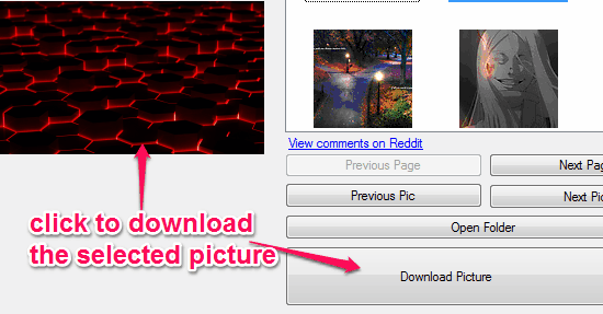 You can select any subreddit (excluding video and movies) to browse the photos, such as: pics, funny, gifs, unexpected wallpapers, etc. It shows all the subreddit pics (including imgur images) on its interface. You can preview any image and can also download that image to PC. Moreover, it lets you view any selected subreddit pics in full screen mode.