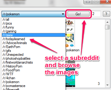 To browse photos present in Reddit database (or gallery) on its interface, you first need to select a subreddit. Using the drop down option present at the top part on its interface, you can choose the subreddit. After this, you can select the page number to browse photos. If you are not sure from which page to start, leave it with page number 1. Now you can tap on Go! button and it will load images on its interface. With a short delay, it will show you images on right part.