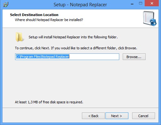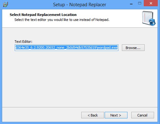 There’s no interface of Notepad Replacer for us to show, because it doesn’t have any. You’ll only be able to see the initial setup wizard. Installation is pretty much the same to any other, with the exception that near the end of it, you’ll have to select the executable of the text editor that you would like to use as the default. Notepad Replacer does the rest on its own.