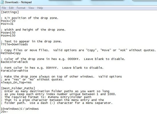 The window you see on your desktop is the default window which points towards C drive “windows” folder and “program files” folder. To make multiple drop zones, you will need to copy the DropZone.exe file and rename them. For changing the destination or drop zone settings you will have to right click and select “Edit settings”. A window open up like shown below. From here you can change the title of the drop zone, the destination folder path of the drop zone, background color of the drop zone, etc.