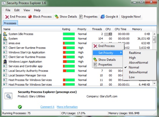 As soon as you launch the app, it will load a list of all running processes and programs on its interface and displays their rating, CPU time, and memory usage. You can use the options listed on the top or in the right-click menu to end a specific process, block it, set its priority, or view its details or properties. You can also “Google it” (just a term used by the app and not the actual Google search engine results) and read the process review on GlarySoft Community.