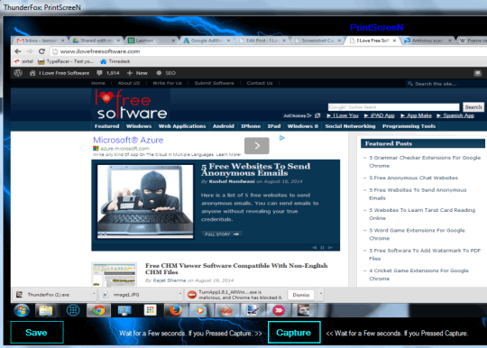 ThunderFox ScreeN Recorder also lets you capture full desktop screen manually and helps to save that snapshot as jpg image. You need to use PrintScreeN option. After this, use CAPTURE button to capture full desktop screen. With a few seconds delay, it will capture the screenshot and show you in its window. From that window, you can save the screenshot to required destination location as jpeg image.
