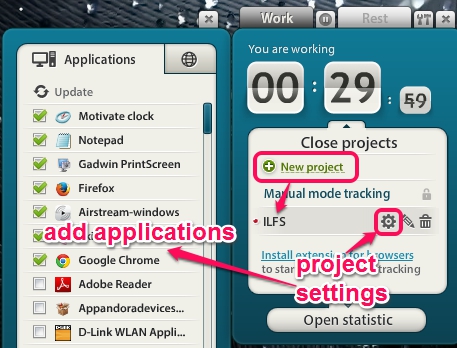 On the other hand, using automatic mode tracking, you will be able to create a project in which you can add those applications whose time you want to track. Click on New project option and give a name to your project. To add applications for tracking their time, use Project settings button, like visible in screenshot below: