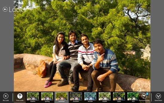 These options include the ability to crop, correct contrast, fix red-eye, auto fix option, etc. The effects are presented under the label called looks as seen below just click on it and you will have all the effects in the form of a film strip in the button part of the apps interface as seen in the first screenshot of the post.