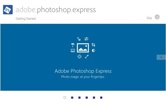 Adobe Photoshop Express for Windows 8 is available in the ‘photo’ section of the Windows Store, and you can get it from the link posted at the end of the article. The posted link will re-direct you to the page from where you can download and install Adobe Photoshop Express for Windows 8 onto your PC. Now run this image editor from the start screen and you will be greeted with the app window as shown below. This is the introduction of the app that will tell you the basics with a few glimpse.