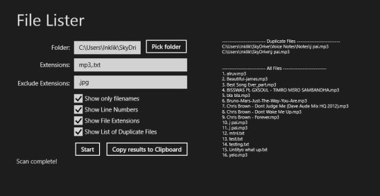 You can choose the specific directory where you want to search. The app automatically searches the sub folders contained inside the specified folder. The app actually searches by the files extensions, so you can add more than one file types in the search field. Plus, to filter the search, you can also add file type extensions in the Exclude Extensions field. There are even more options that let you choose if you want to view only the filename or the complete directory path of the file, show file extensions, and show list of duplicate files. All you have to do is fill the fields by specifying file extensions and check on the requisite options, and simply click on Start. The app will show you all the relevant results in just few minutes.