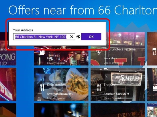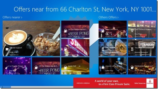 Four Offers is a free Windows 8 Deals app. Using this Windows 8 app you can actually find the best offers in various deals near you. The deals basically include deals for everything, for example, best deals related to food and dinning, shopping, going for a concert, buying electronics, beauty and style, yoga studios, and automotive shops etc. This location based Windows 8 shopping app integrates with the foursquare website, which is also a location based social networking website for mobile devices, and helps you in finding the best deals to buy. Besides that, you can also view photos, and comments or tips related to offers. And use the Windows 8 Share charm to share an offer with friends.